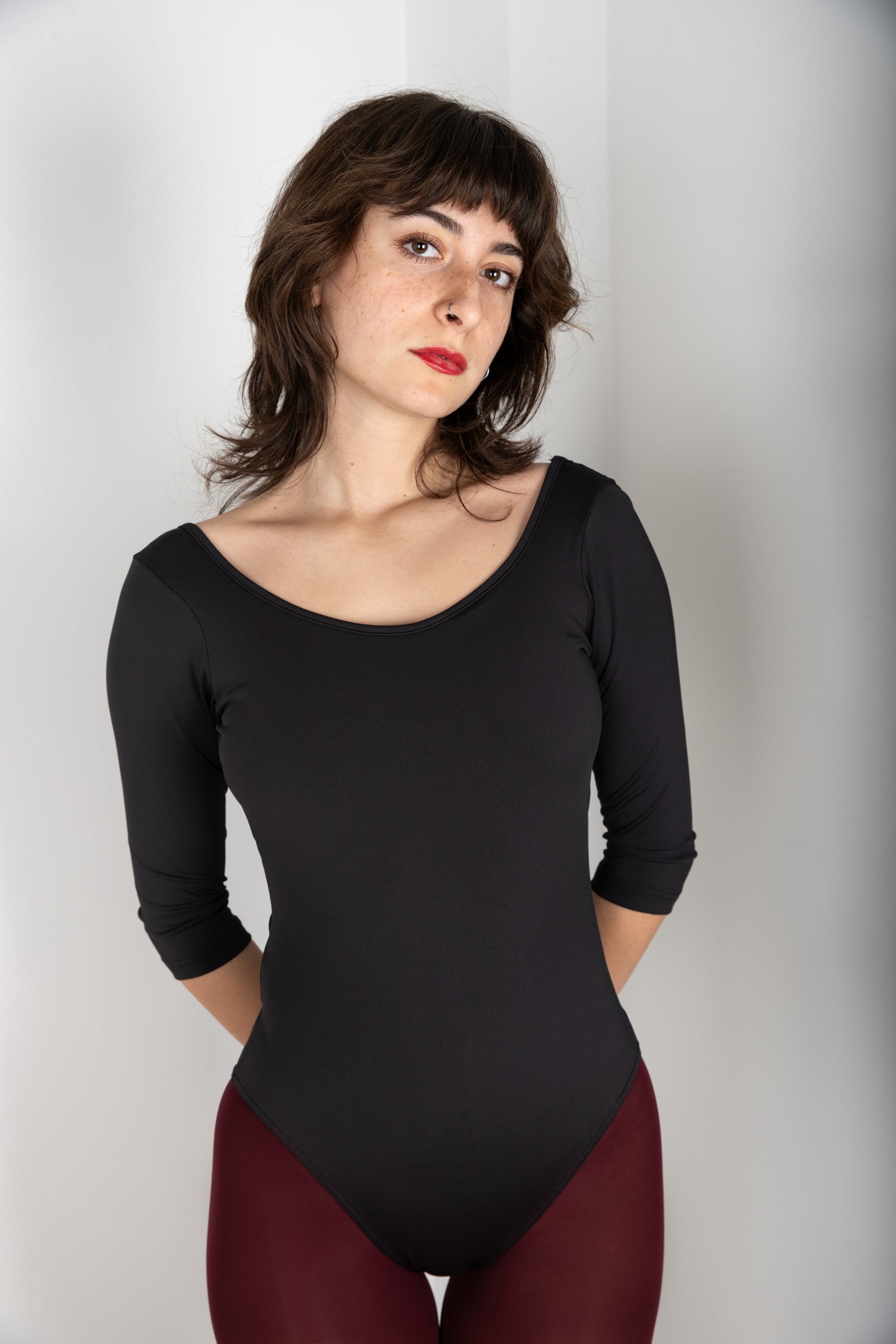 Με λαιμόκοψη χαμόγελο και ανοιχτή τετράγωνη πλάτη που αναδεικνύει τις γραμμές του σώματος.