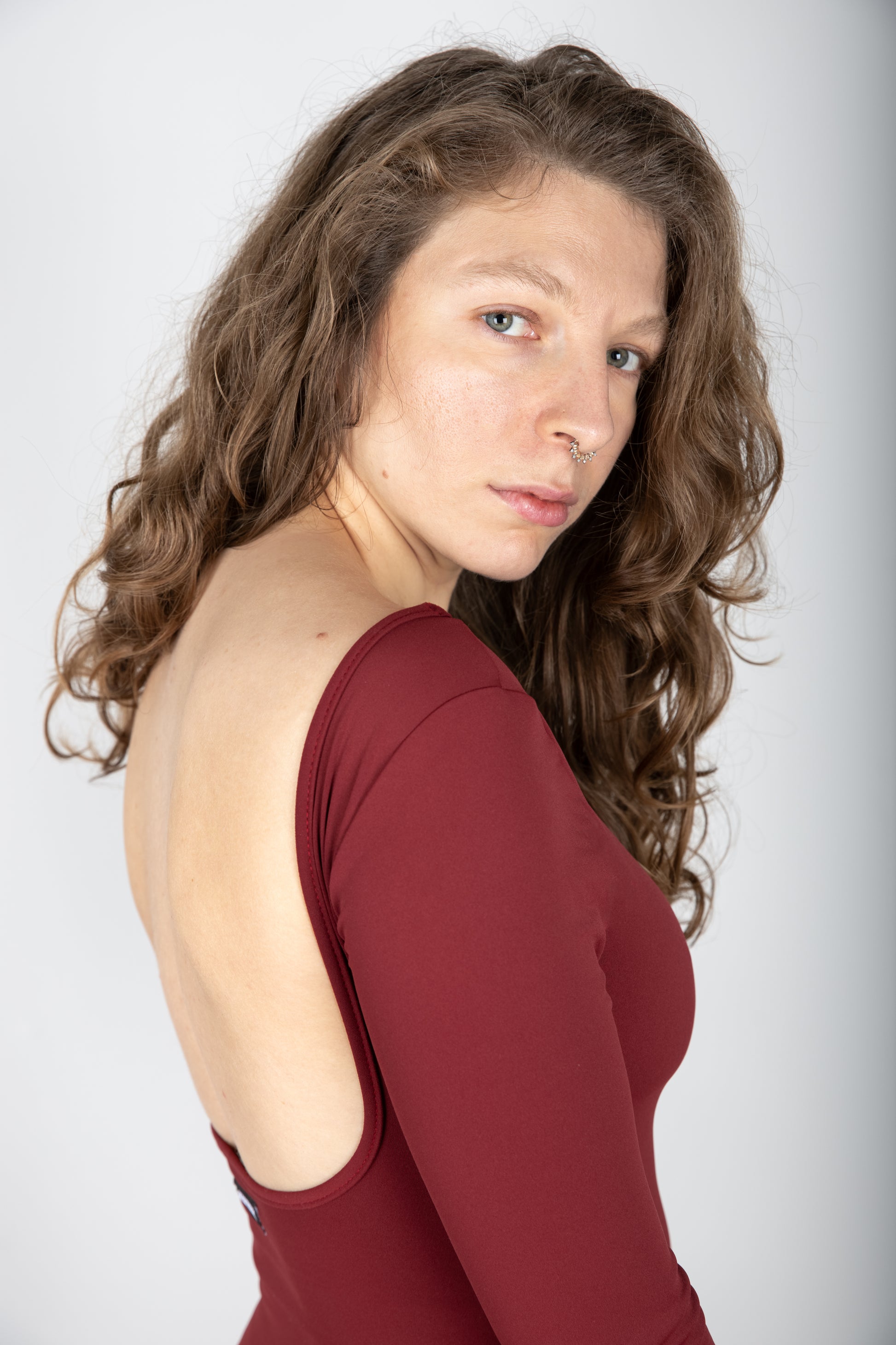 Με λαιμόκοψη χαμόγελο και ανοιχτή τετράγωνη πλάτη που αναδεικνύει τις γραμμές του σώματος.